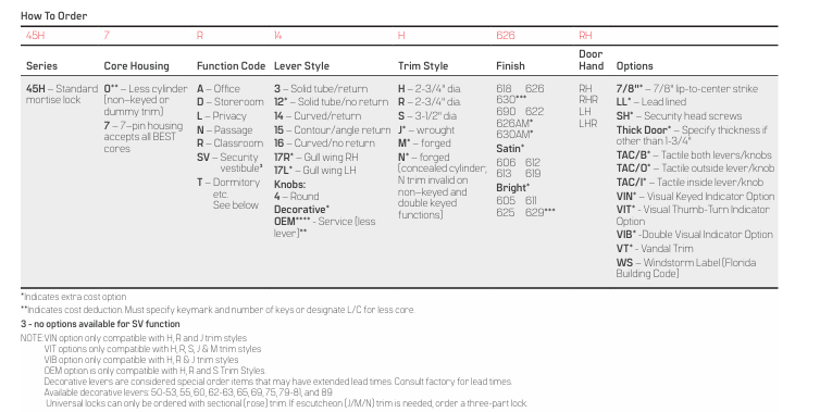 45H Series – ANSI A156.13, Series 1000, Grade 1 Operation and Strength, Grade 2 Security. To meet Grade 1 Security, a drill resistant core (1CD, 1CDP, 1CDF, or 1CDX) must be used with escutcheon trims, and 1EK7K4 high security cylinder must be used with sectional trims.