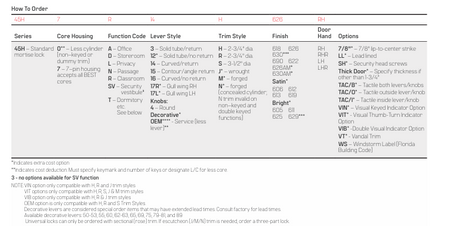 45H Series – ANSI A156.13, Series 1000, Grade 1 Operation and Strength, Grade 2 Security. To meet Grade 1 Security, a drill resistant core (1CD, 1CDP, 1CDF, or 1CDX) must be used with escutcheon trims, and 1EK7K4 high security cylinder must be used with sectional trims.