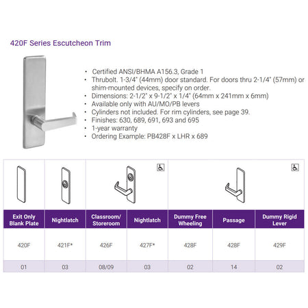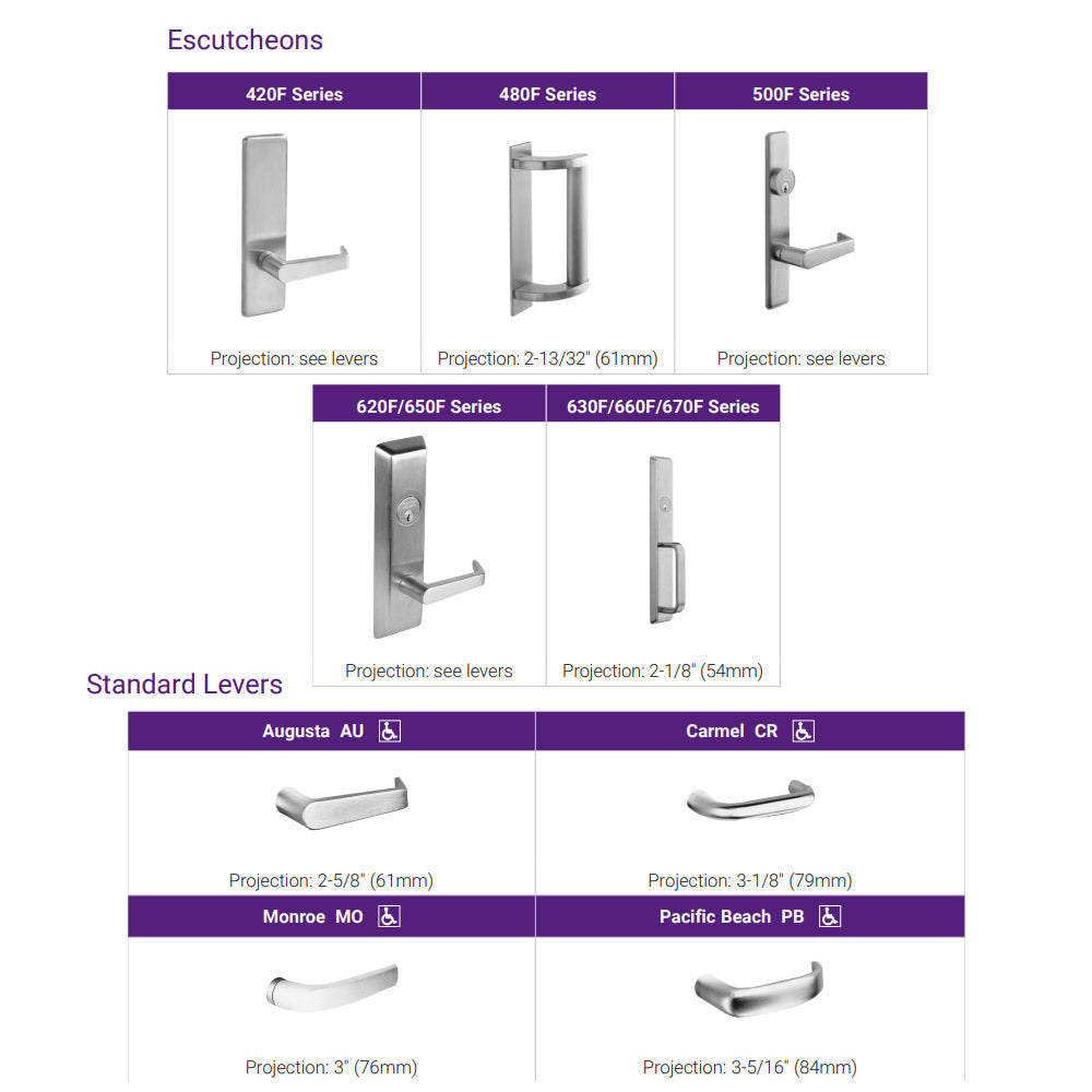 Perfect for use with exit devices, the 420F Series offers a variety of functional options to meet your facility’s needs, from nightlatch and classroom functions to passage and dummy lever trims.