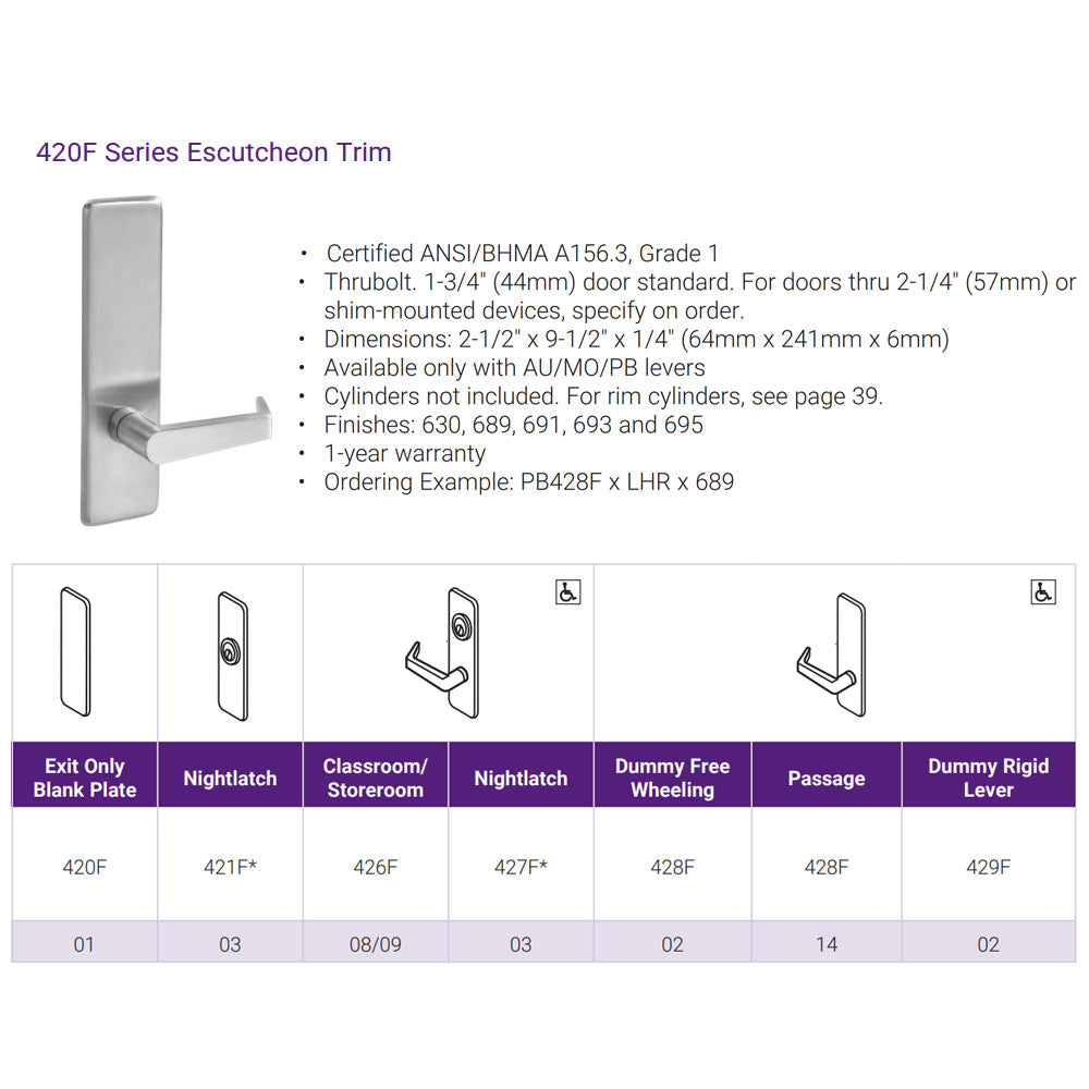 Perfect for use with exit devices, the 420F Series offers a variety of functional options to meet your facility’s needs, from nightlatch and classroom functions to passage and dummy lever trims.