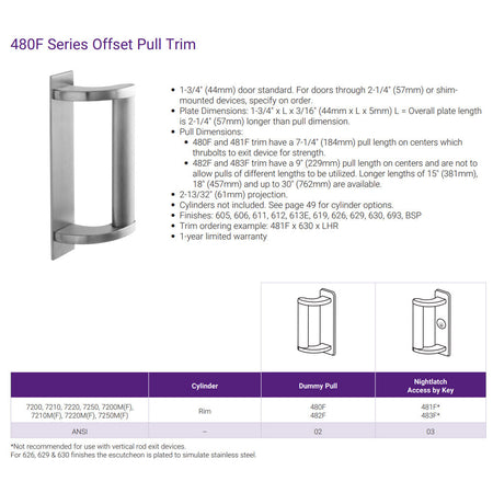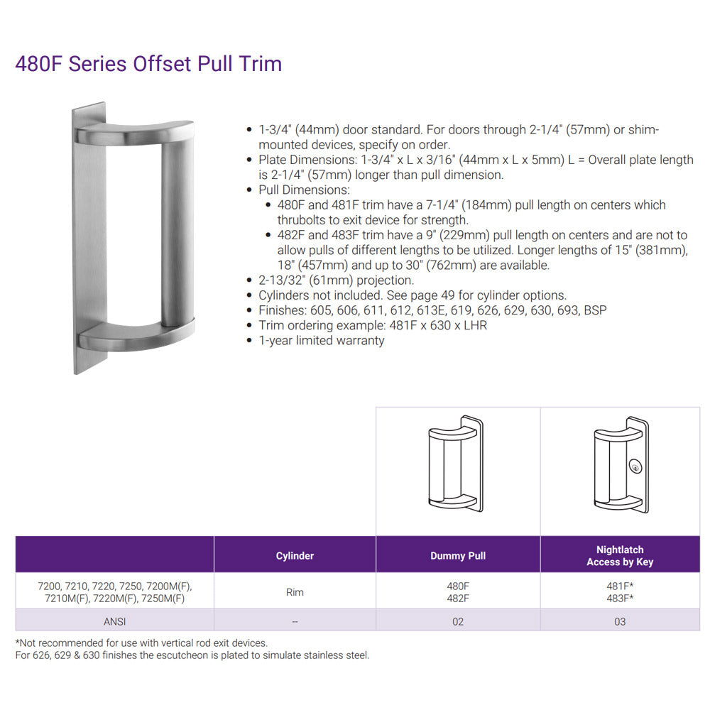 Enhance your door hardware with the 480F Series Offset Pull Trim—engineered for strength, compatibility, and modern appeal. Ideal for commercial and institutional applications, this trim is designed to seamlessly pair with a variety of exit devices, offering flexible sizing and finish options to meet the demands of your project.