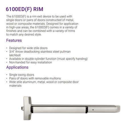 Available in both wide stile (6100ED) and narrow stile (6200ED) configurations, these exit devices are engineered for versatility—supporting rim, mortise, SquareBolt®, surface vertical rod, and concealed vertical rod options. The heavy-duty aluminum rail design with a modern touch bar blends seamlessly into any environment, while advanced engineering ensures quiet, smooth operation and enhanced vandal resistance.
