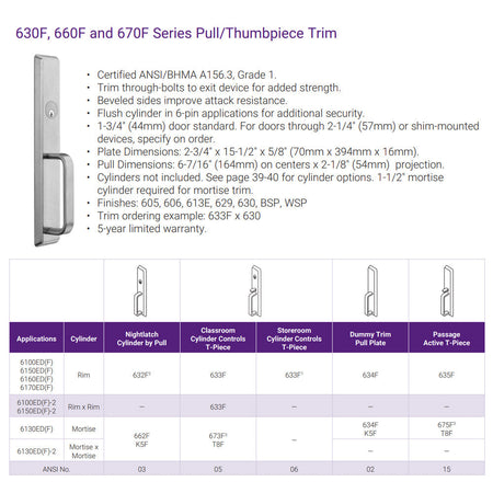 Upgrade your exit device system with the 630F, 660F, and 670F Series Pull/Thumbpiece Trim, engineered for strength, security, and long-lasting performance. Designed to meet the rigorous standards of ANSI/BHMA A156.3, Grade 1 certification, these trims deliver unmatched reliability for high-traffic commercial applications.