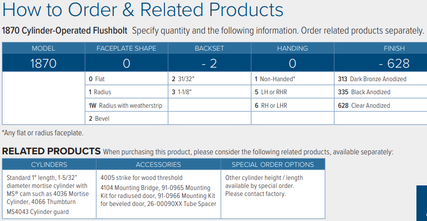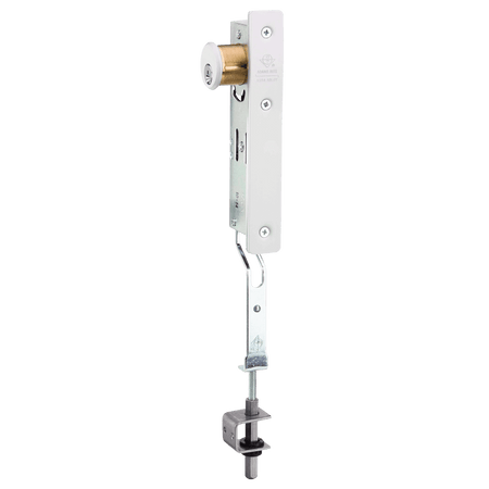 Designed for use instead of conventional flip-lever operated flushbolts, 1870 Cylinder-Operated Flushbolts give building management key control of the inactive leaf of paired narrow stile aluminum doors. Prevents casual locking of the inactive leaf by unauthorized persons. Uses same basic over-center action mechanism as MS® pivoted bolt deadlocks. Recommended for installation at both top and bottom of inactive door with MS1850S MS Deadlock in active doorfor greatest security. May be installed to lock at threshold or at header.