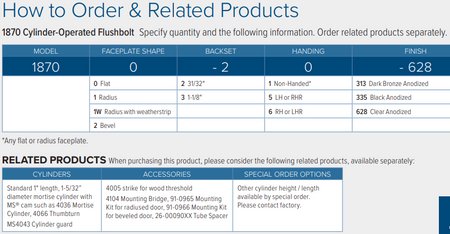 Standard Package: Flushlock mechanism boxed with actuator arm attached, rod/bolt assembly unattached. Stainless steel bolt guide, mounting screws, and installation instructions included. Cylinder available separately.