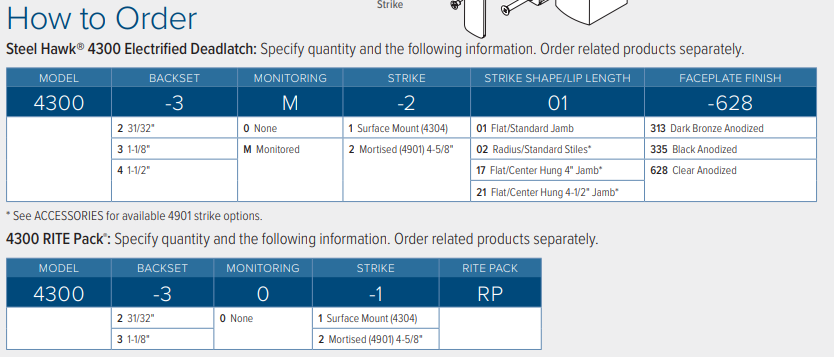 RITE Pack®: Pairs the non-handed, narrow backset, electrified deadlatch with multiple faceplates in a single package. Includes one electrified deadlatch and four faceplates: 2 flat faceplates, 2 radius faceplates: one each of 628 Clear and one 313 Dark bronze anodized finish.