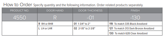 Available in choice of powder coat 119 to match 335 Black anodized, 121 to match 313 Dark bronze anodized, and 130 to match 628 Clear anodized