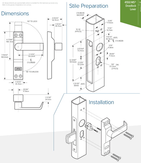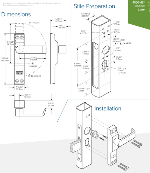 Compatible Locking Devices: Any MS® pivoted bolt deadlock including“Schoolhouse” versions can be fitted with the 4550 including MS1850S, MS1950. Derivative units such as 1870 or 1870HM, flushbolts that bolt into threshold are also operable by the 4550 lever. Not compatible with MS+1890 Deadlock/Deadlatch or 2190 Interconnected Deadlock/Deadlatch or with 7/8" [22.2 mm] backset locks.