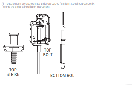 Bolts and Strikes: The patented top latching mechanism utilizes a rotating top bolt which latches around the header strike, interlocking the door to the frame. Adjustable steel rods protected in contoured covers. The hexagonal, hardened steel bottom bolt is shielded ina cast housing for strength and stability. Supplied with standard header strike.