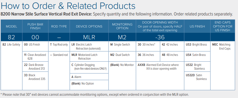 • Electrification Options: (MLR) Motorized Latch Retraction, Electric Latch Retraction (LR), Alarm, Monitoring