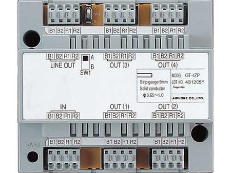 The GT-4ZP allows one PS-2420UL to power up four GT-1C7W app-enabled tenant stations. The GT-4ZP replaces existing GT-4Z adaptors in a standard GT system, and requires 1 PS-2420UL per GT-4ZP. Each GT-4ZP includes 4 power jumpers (GTW-24J) that are to be installed on the GT-1C7W between the B1/B2 and +/- terminals, which provides power to the GT-1C7W without having to install a local PS-2420UL for each tenant station.