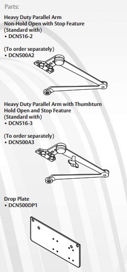 DCN5xx-2 has a heavy duty parallel arm with a stop feature for door openings between 90° and 110°.