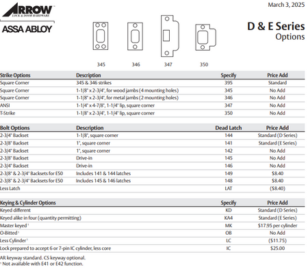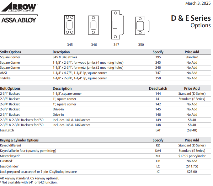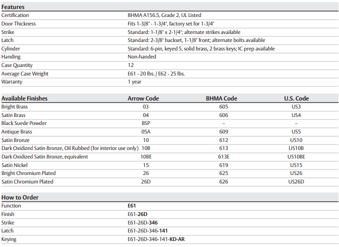 Arrow E61 Single Cylinder Deadbolt. Arrow E Series deadlocks are unsurpassed for value, quality and durability. Our tamper resistant rotating wrench-proof collar, steel deadbolt with hardened steel pin insert and concealed screws are security features that have made the E Series the most specified deadlock in its class.