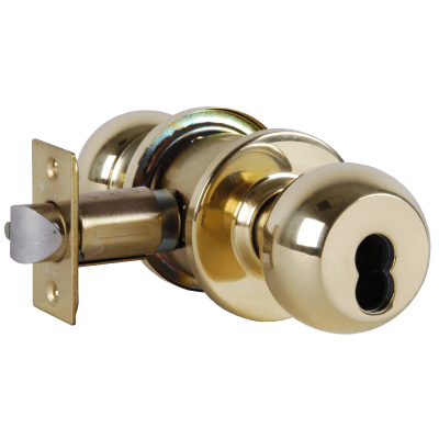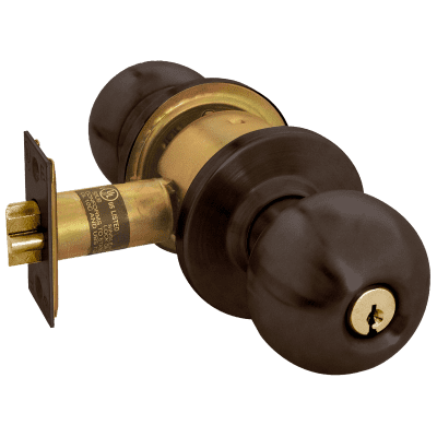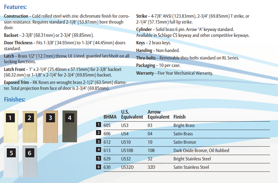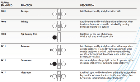 Cylinder: Conventional - Solid brass 6 pin. Arrow "A" keyway standard. C keyway optional. Interchangeable Core – Lockset prepared to use with 6 or 7 pin interchangeable core. Will accept cores manufactured by Arrow, Best, Falcon, Medeco Keymark, ASSA, and others.*