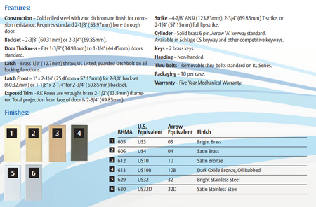 Construction: Cold rolled steel with zinc dichromate finish for corrosion resistance. Requires standard 1-1/8" (53.97mm) bore through door.
