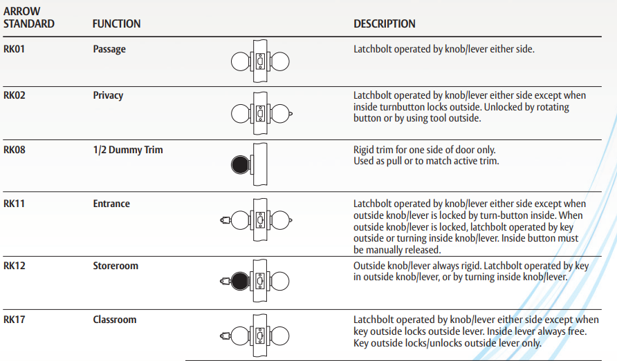 Cylinder: Conventional - Solid brass 6 pin. Arrow "A" keyway standard. C keyway optional. Interchangeable Core – Lockset prepared to use with 6 or 7 pin interchangeable core. Will accept cores manufactured by Arrow, Best, Falcon, Medeco Keymark, ASSA, and others.*