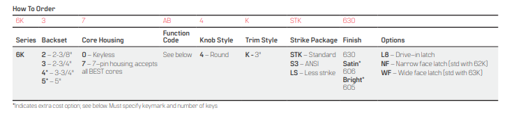 Backset: 2 3/8" for 62K Series; 2 3/4" for 63K Series; 3 3/4" for 64K Series; 5" for 65K Series.