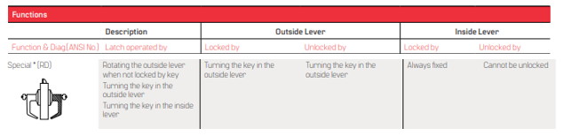 • The innovative design of the slotted key release cam and locking lug assembly create maximum attack resistance. Even though damaged, the lock still allows key access. In addition, the lever is fully functional from the inside. The hub-mounted torsion spring and strong retractor springs help prevent lever sag and offer a smooth and snappy operation.