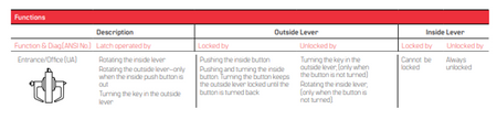 - The innovative design of the slotted key release cam and locking lug assembly create maximum attack resistance. Even though damaged, the lock still allows key access. In addition, the lever is fully functional from the inside. The hub-mounted torsion spring and strong retractor springs help prevent lever sag and offer a smooth and snappy operation.