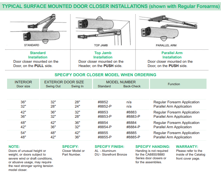 ■ Furnished with regular arm. Hold-open arms optional. Holdopen arms are adjustable from 100° to 180° of door