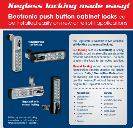 CompX RegulatoR, vertical with knob at bottom mount, is a keyless, electronic push button lock for cabinet door and drawers; lockers and other similar enclosures.
