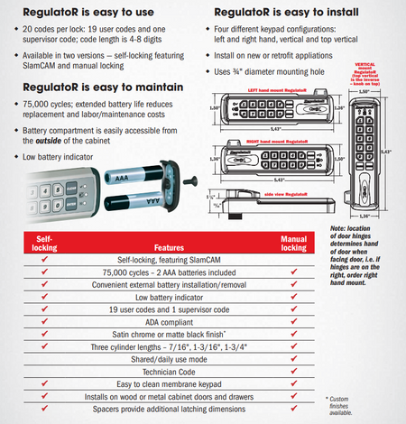 CompX RegulatoR, electronic push button cabinet lock with 1-3/16" cylinder length, vertical mount, manual version, 20 codes per lock, 75,000 cycles battery life, AAA battery compartment is easily accessible from the outside of the cabinet, low battery indicator, batteries included, ¾" diameter mounting hole, satin nickel finish.