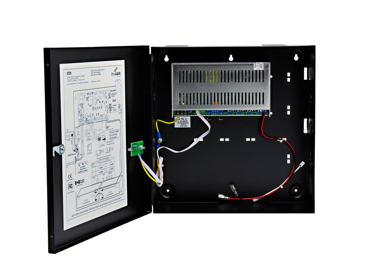The DynaLock 5725 Series Power Supply/Charger supplies a regulated 12 VDC or 24VDC at 1.5 Amps nominal continuous current. It’s housed in hinged, locking steel enclosure