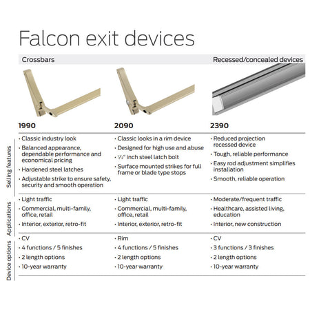 The 1990/2090 Series offer many levers and finishes. Refer to the Falcon Cross Bar catalog for more information.