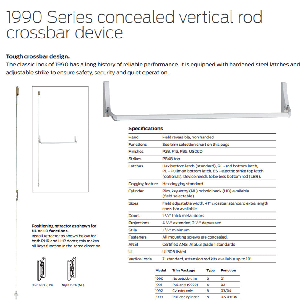 The 1990/2090 Series are suitable for retrofit applications with interior and exterior doors in commercial and retail installations. Features include standard hex dogging and concealed mounting screws to prevent tampering. Options include two lengths that can be cut down to size, four functions and four finishes to cover any building needs.