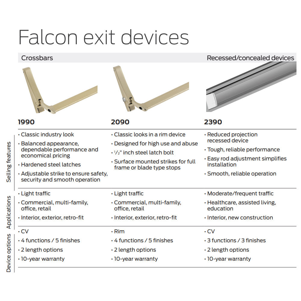 The 1990/2090 Series offer many levers and finishes. Refer to the Falcon Cross Bar catalog for more information.