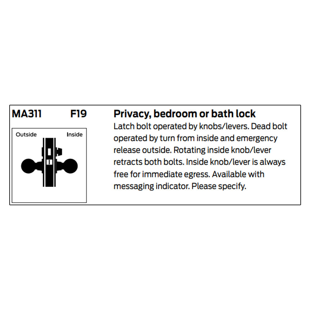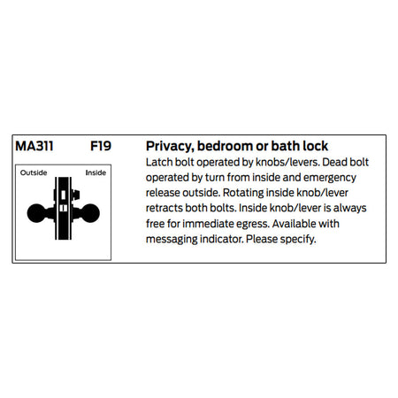 Falcon MA311 Privacy, Bedroom or Bath Lock - Grade 1 Non-Keyed Mortise Lock