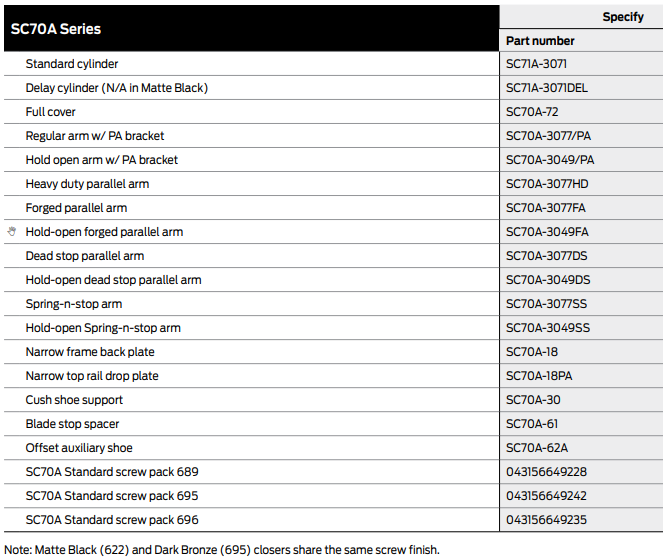The SC70A Series features a single-piece cast aluminum body, a heat-treated forged steel piston and a double heat-treated pinion. Its non-handed design allows the closer to mount on left or right swinging doors. The SC70A Series is UL listed, is a certified ANSI/BHMA A156.4 Grade 1 product and is backed by a 10-year warranty. It also meets the ADA and ANSI A117.1 standards for accessibility.