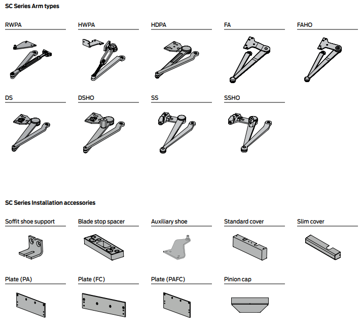 Visit the Falcon Door Controls catalog for SC70A Series mounting details, arm options and accessories.