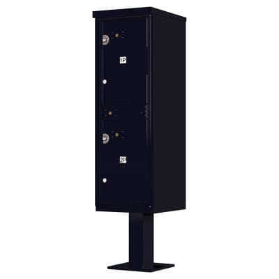 Front loading, pedestal mounted OPL parcel locker unit includes a carrier access door prepared for a USPS arrow lock (installed by local postal officials) and two USPS serviced parcel lockers for package and parcel delivery to your neighborhood.