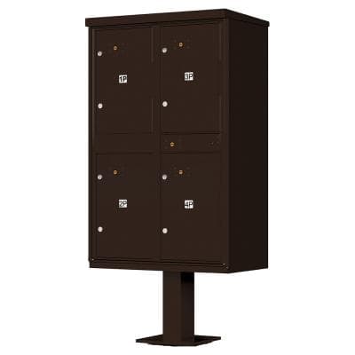 Front loading, pedestal mounted OPL parcel locker unit includes a carrier access door prepared for a USPS arrow lock (installed by local postal officials) and four USPS serviced parcel lockers for package and parcel delivery to your neighborhood.