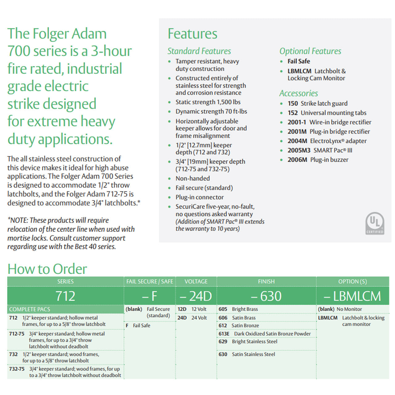 The HES Folger Adam 700 series is a 3-hour fire rated, industrial grade electric strike designed for extreme heavy duty applications.