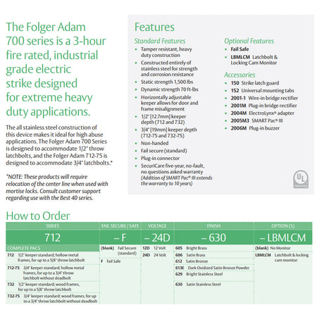 The HES Folger Adam 700 series is a 3-hour fire rated, industrial grade electric strike designed for extreme heavy duty applications.