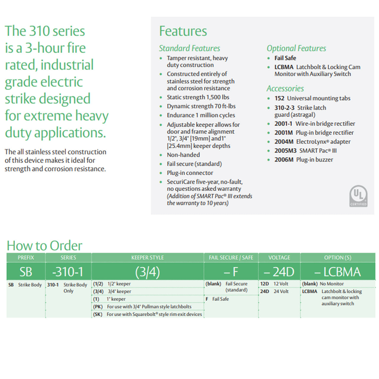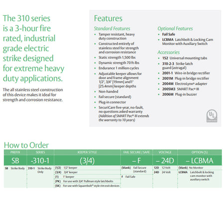 The 310 series is a 3-hour fire rated, industrial grade electric strike designed for extreme heavy duty applications.