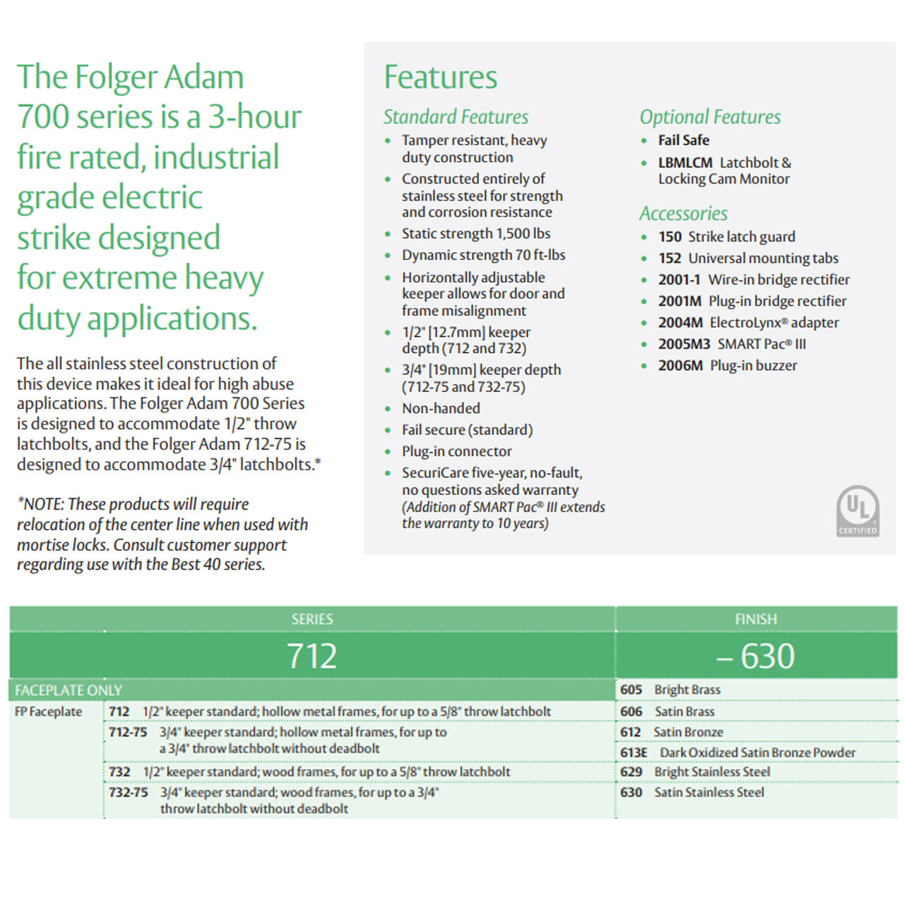 The HES Folger Adam 700 series is a 3-hour fire rated, industrial grade electric strike designed for extreme heavy duty applications.