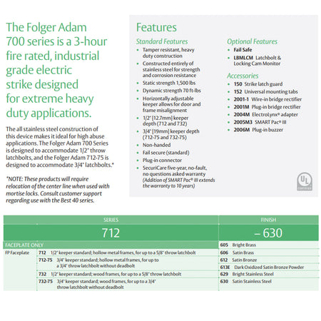 The 700 series is a 3 hour fire-rated, industrial grade electric strike designed for extreme heavy duty applications. The all stainless steel construction of this device makes it ideal for high abuse applications. The 712 series is designed to accommodate 1/2" throw latchbolts, and the 712-75 is designed to accommodate 3/4" latchbolts. *NOTE: These products will require relocation of the center line when used with mortise locks. Consult customer support regarding use with the Best 40 series.