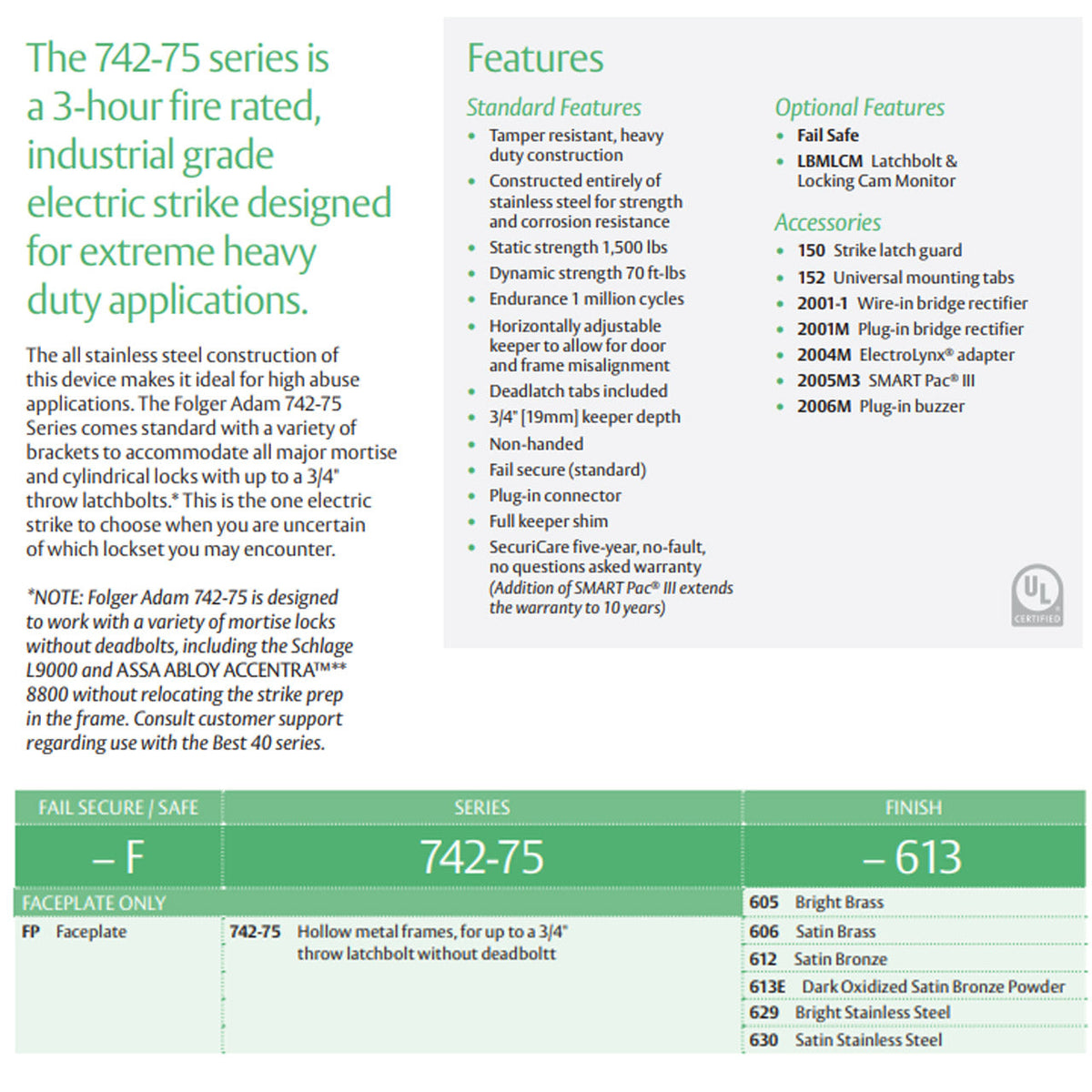 The all stainless steel construction of this device makes it ideal for high abuse applications. The Folger Adam 742-75 Series comes standard with a variety of brackets to accommodate all major mortise and cylindrical locks with up to a 3/4" throw latchbolts.* This is the one electric strike to choose when you are uncertain of which lockset you may encounter.