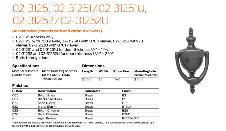 The door knockers and viewers are available in many finishes. Please refer to the Ives Full Line catalog for specific product finish availability.