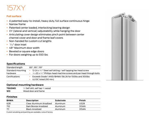 - A patented, easy-to-install, heavy-duty, full surface continuous hinge;
