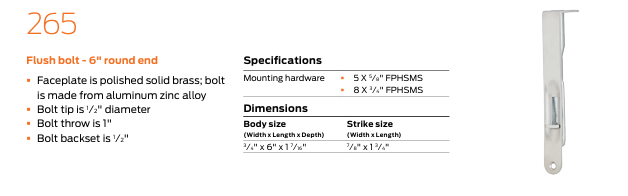 265 FLUSH BOLT - 6" ROUND END