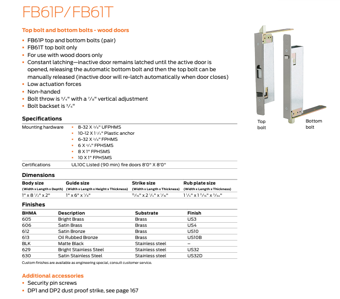 FB61P TOP AND BOTTOM BOLTS (PAIR), FB61T TOP BOLT ONLY