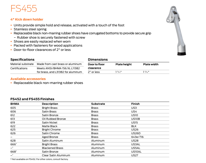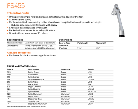 - Kick down holder: Kick down holders are mounted to the door face and can either be in the up position to let the door swing freely or the down position to hold the door open at different angles