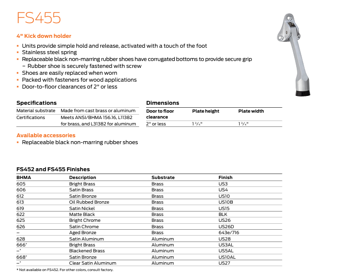 - Kick down holder: Kick down holders are mounted to the door face and can either be in the up position to let the door swing freely or the down position to hold the door open at different angles