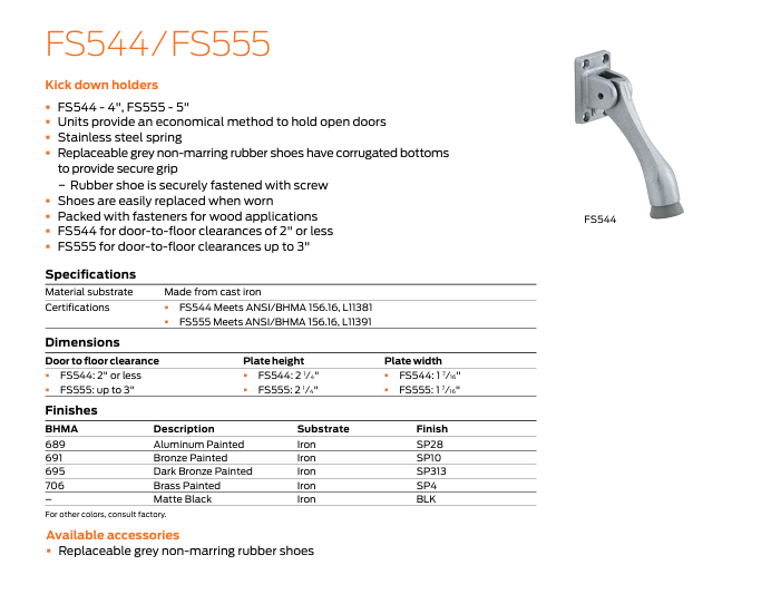 • Kick down holder: Kick down holders are mounted to the door face and can either be in the up position to let the door swing freely or the down position to hold the door open at different angles