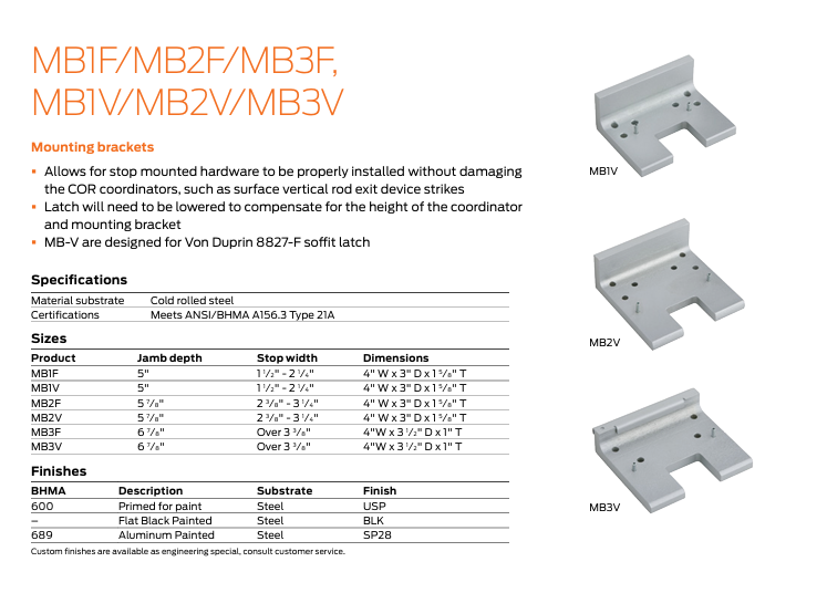 • Mounting brackets (MB1 and MB2): These brackets allow stop-mounted hardware to be properly installed without damaging the COR coordinator, such as a parallel arm closer or a non-fire-rated surface vertical rod strike. Stop-mounted hardware will need to be lowered to compensate for the height of the coordinator and mounting bracket. Fire-rated mounting brackets (MB1F, MB2F, MB3F, MB1V, MB2V and MB3V) are also offered.