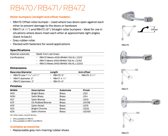 - RB470 Offset roller bumper. Used where two doors open against each other to prevent;